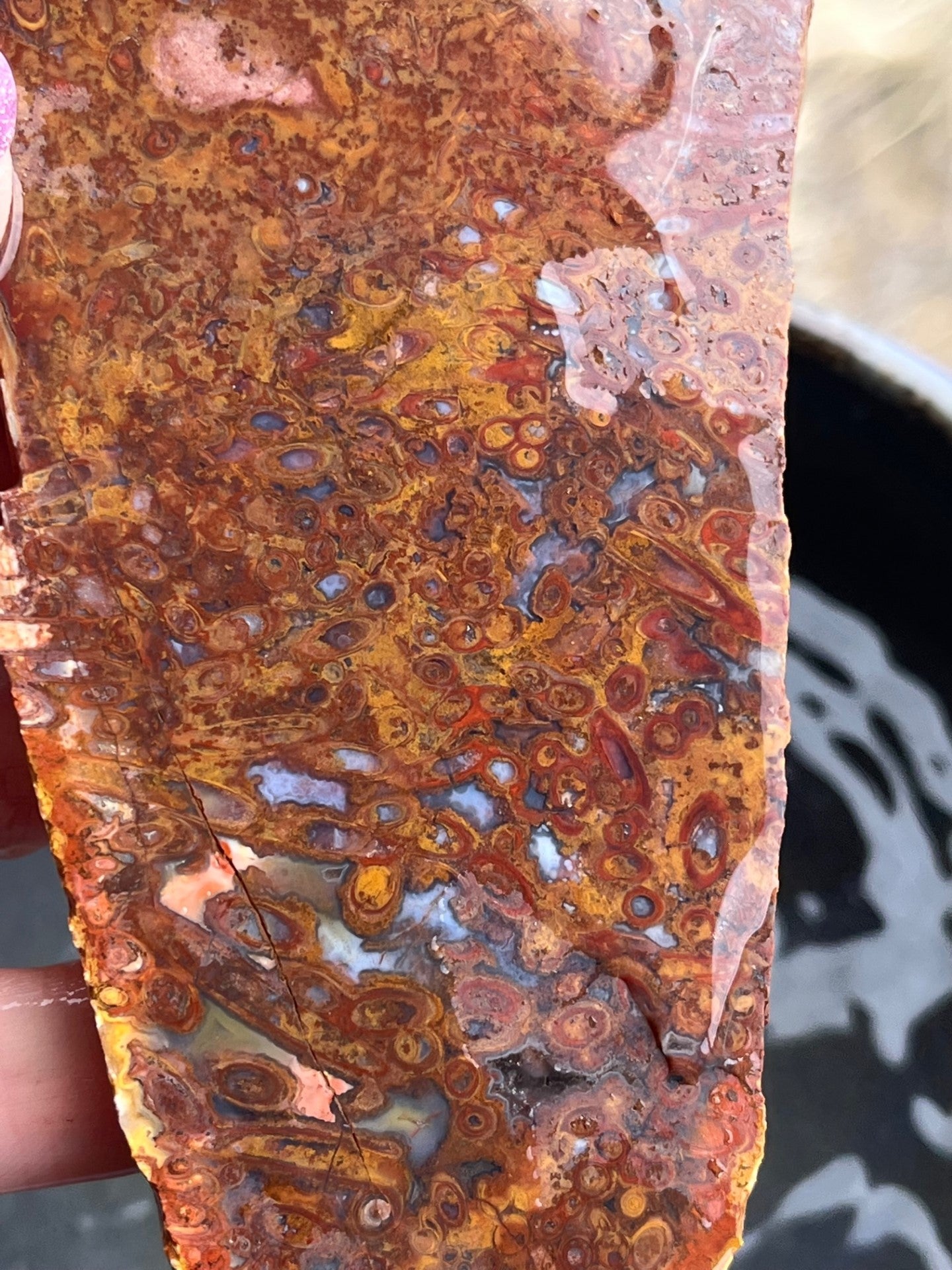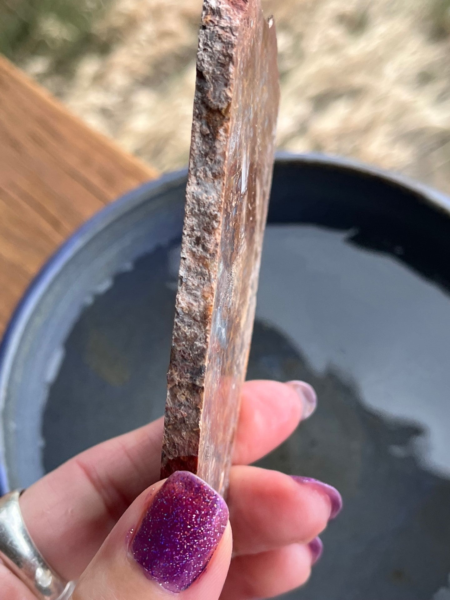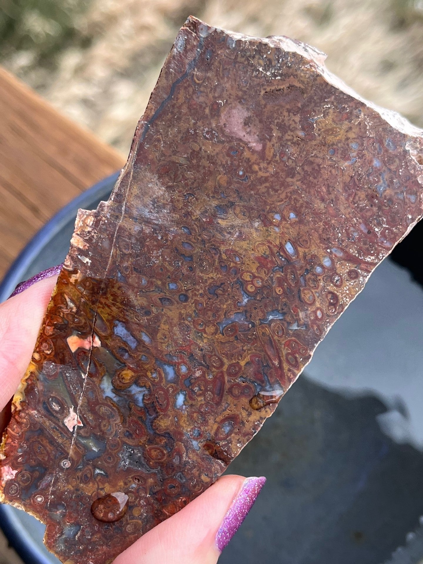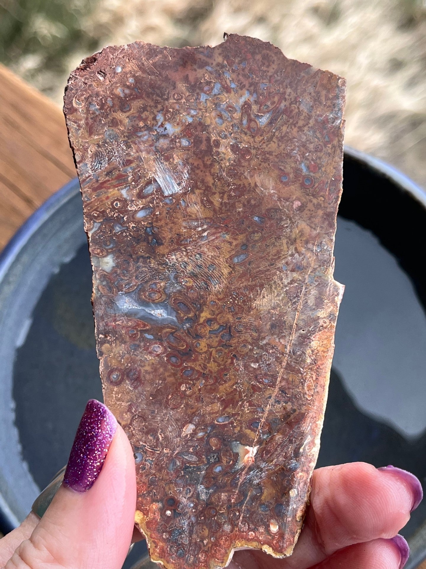 Indonesian stromatolite lapidary supplies stone slab measuring 4 1/4 inches across and 6mm thick. Not polished. Tones of brown and gold.