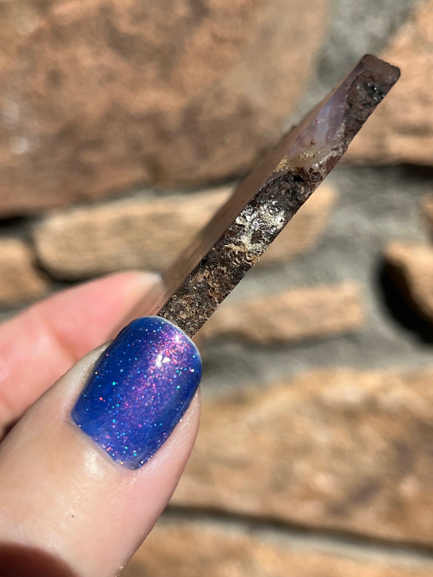 This laguna lace agate is a rare specimen showing a pseudomorph interruption within the banding of this slice. It measures 3 inches across it's two widest points and a thickness of 5.5mm. Not polished on either side. Shown wet and dry in the pictures.