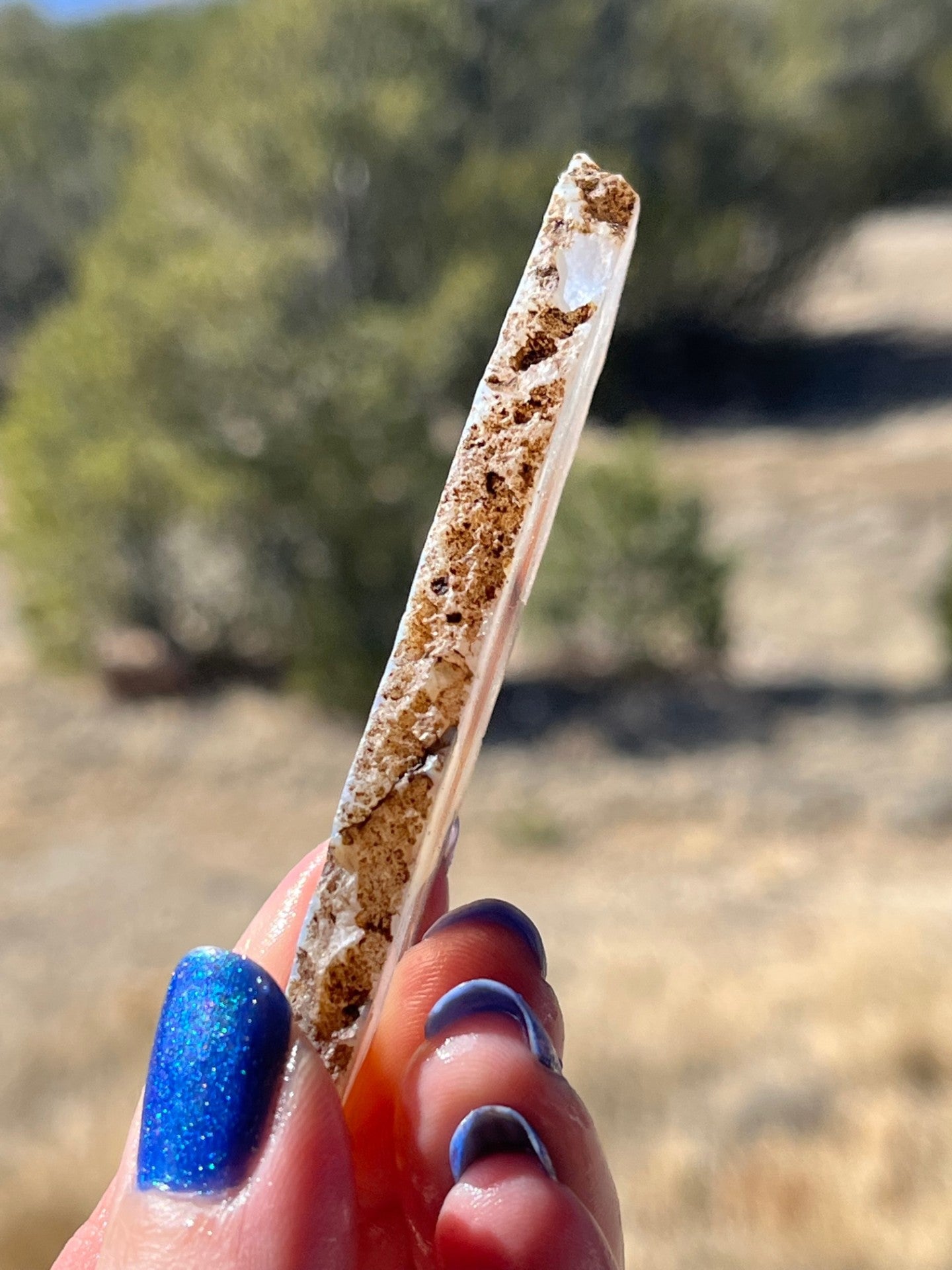 Translucent clear and red banded Milawi lapidary stone slab measuring 3 1/2 inches at it's two widest points and the slab is 6.5mm thick.