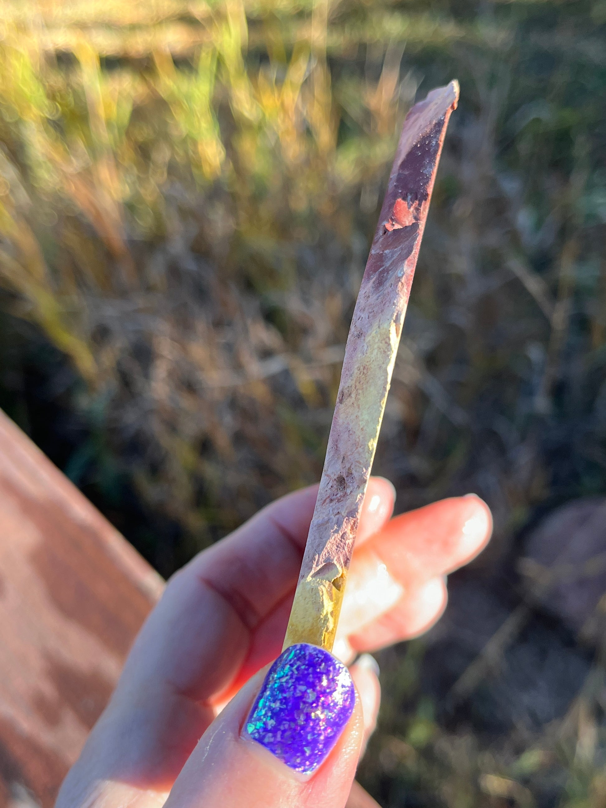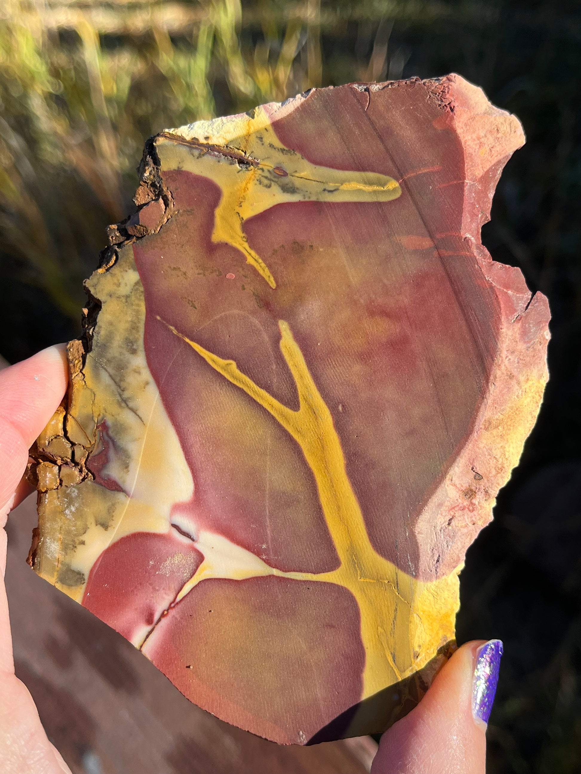 This Mookaite mostly all solid has a nice pattern and interest. Mostly wine colored with some golden lightening shapes that run through the slab. This slab measures 4 3/4 inches X 3 1/4 inches and is 7.5mm thick.
